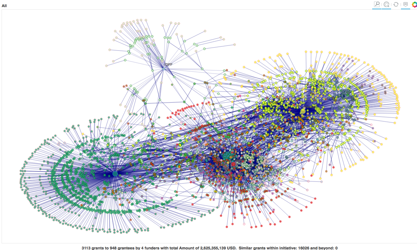 The approach described in this paper with the example data scraped from the websites of four major environmental and climate change funders may motivate other funder alliances and intermediaries to structure and collect grant data in such a way that modern big data tools can be applied for visualization and analysis. Explicating the complexity of stakeholder ecologies with the help of network representations and then using algorithms to visualize and better understand the underlying structures can be a useful step in addressing the challenges of overcoming silo thinking and moving towards more systemic change.